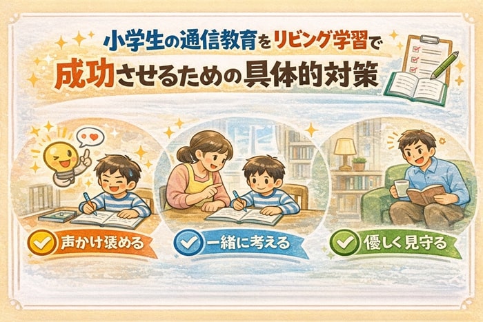 小学生の通信教育をリビング学習で行う際、親の関わり方は自然任せにしないことが重要。