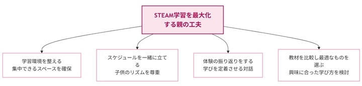 通信教育を活用したSTEAM学習は、親が環境を整え、学びを促すことで大きな成果を得られます。以下は、学習効果を高めるための具体的な工夫例です。