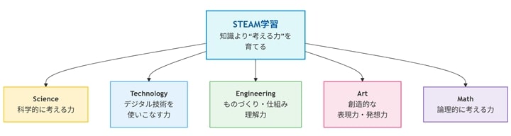 この5つを組み合わせることで、単なる「知識の暗記」ではなく、「自分で考え、工夫し、表現する」学びを実現できるのがSTEAM学習です。