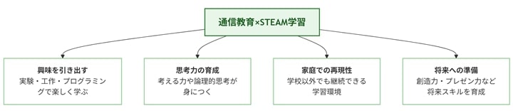 | 家庭での再現性 | オンライン教材や通信教育を通して、学校以外でも継続的なSTEAM学習が可能。 |