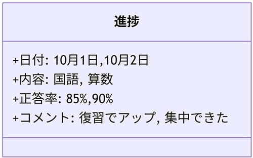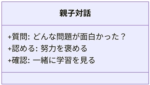 ただ教材をこなすだけで終わる | 「今日できたこと」を親子で話し合い、理解を深める時間を設ける。 |
